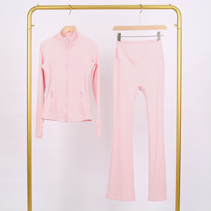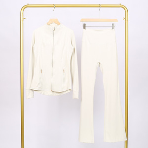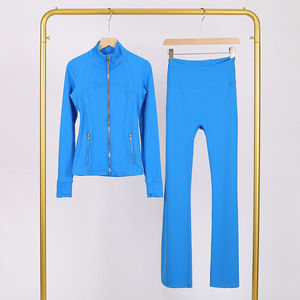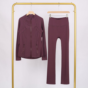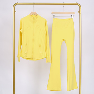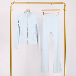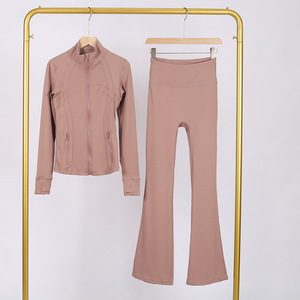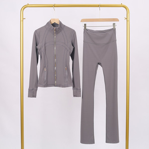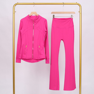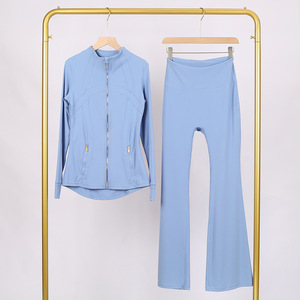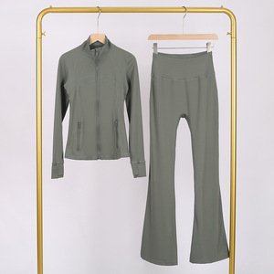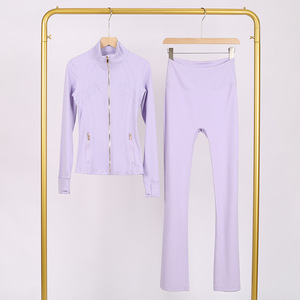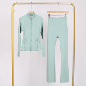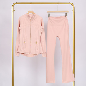 LULU DF スタンドカラージャケット ベルボトムスーツ ゴールドジッパー付きトップス レディース スリムフィットジャケット ストレッチヨガウェア 女性用